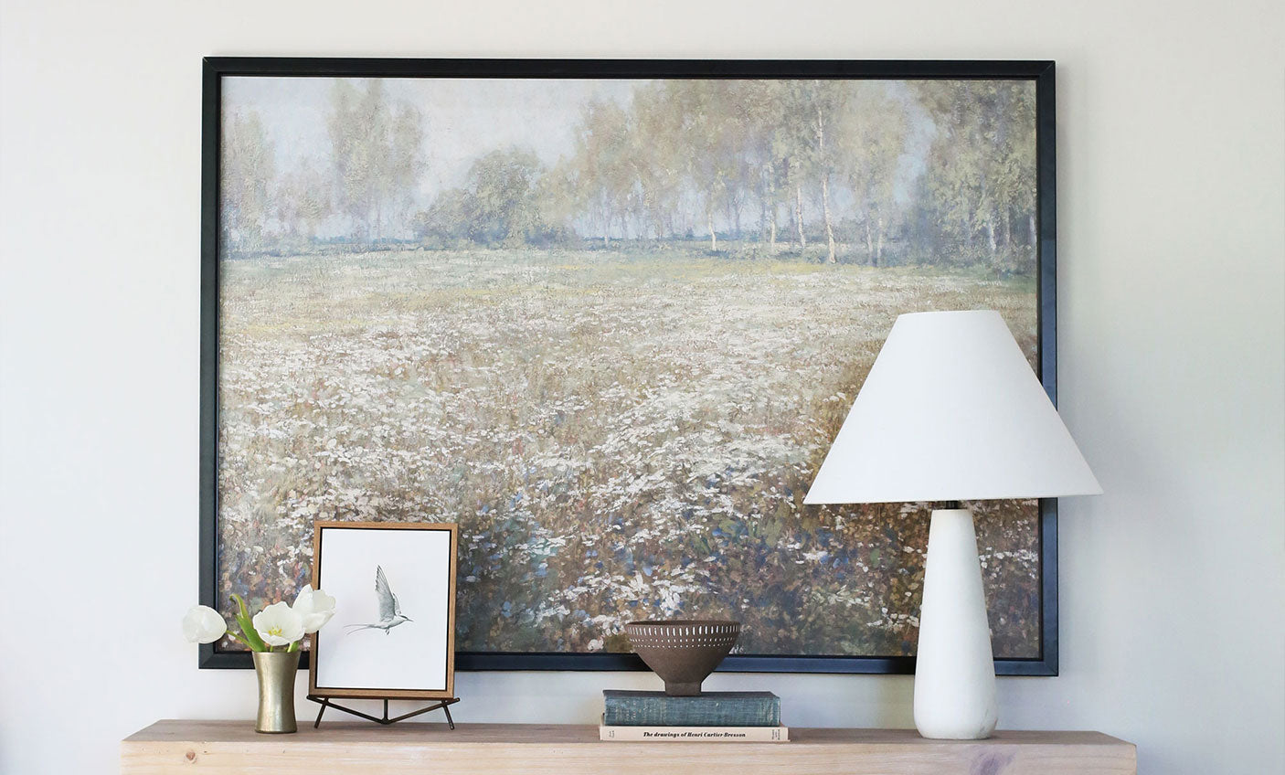 We know framing large art prints can be really expensive. Luckily our paper and canvas prints have been sized to fit in IKEA’s incredibly affordable Bjorksta frame*! The paper and canvas that we use for our prints are each UV resistant and have a matte finish, so they work perfectly with the Bjorksta, which doesn't need glass.