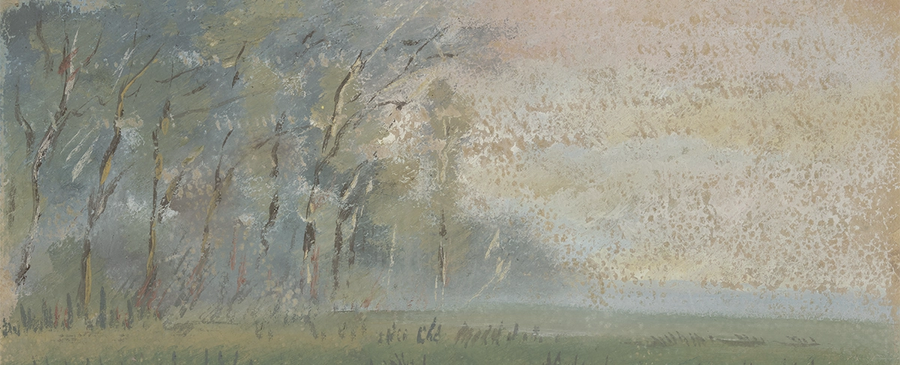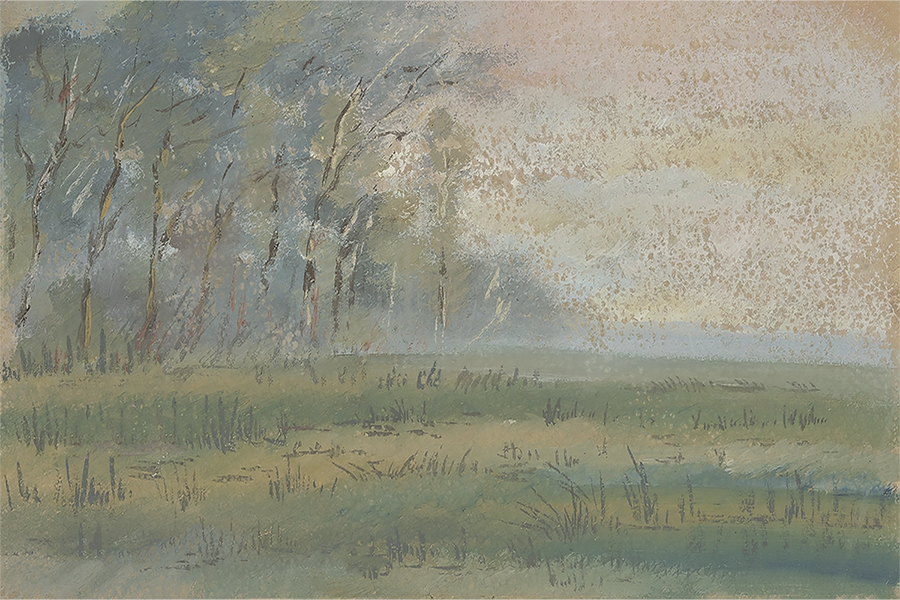 About The Print: Soft light bathes the greens and blues of a french valley lined sparsely with trees. Oil on canvas.
