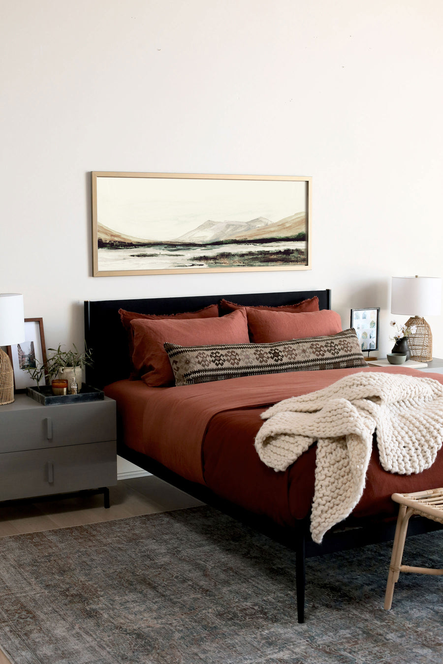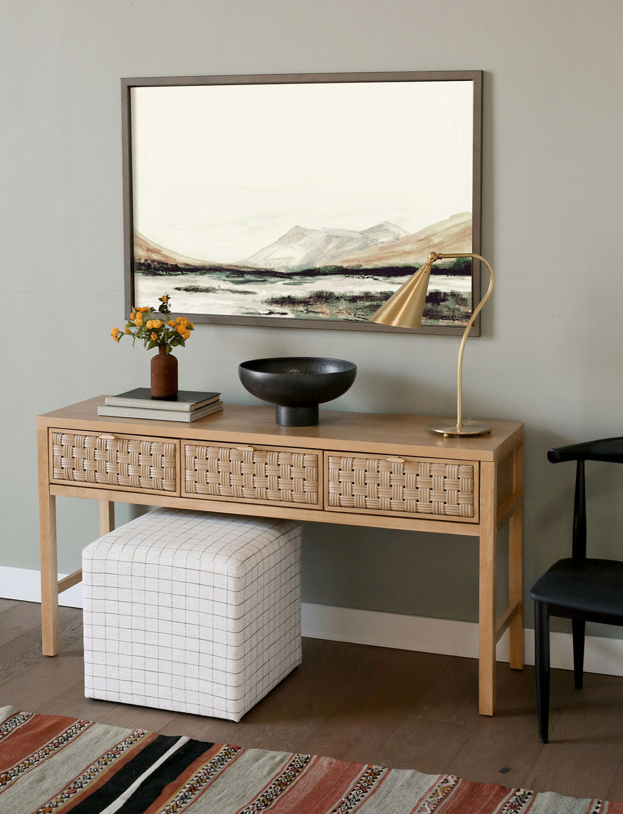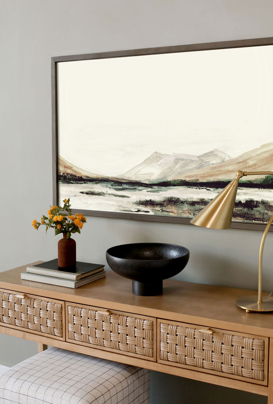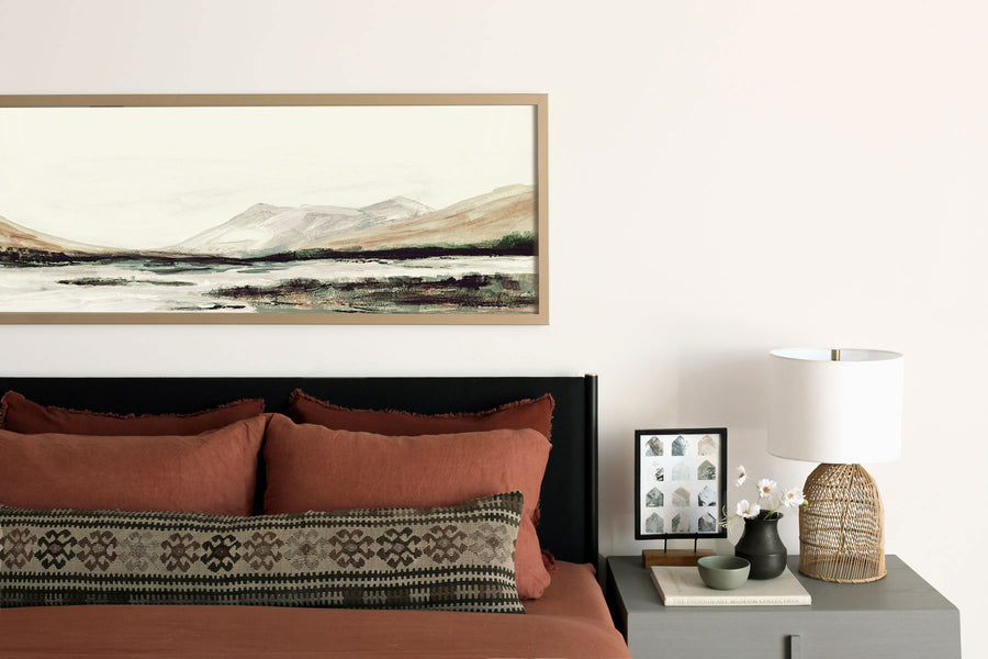 Why We Love It: This piece was created by Mande Calhoun-Gaffney in her signature landscape style. Her work is minimal yet impactful, letting the shape and colors define the feeling of the piece. This art print is subtle and soft, with interesting contrast and movement. It features a beautiful blend of color temperature- cool and warm tones, and unique green tones throughout.
