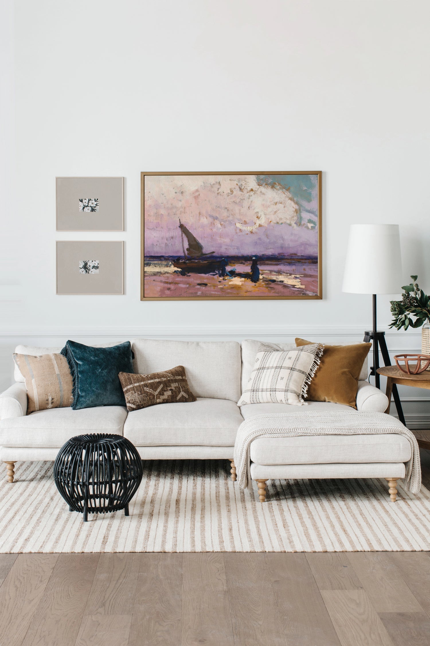 About The Print: A small sailboat sits shoreside backdropped but an evening sea and sky colored in purple hues. Oil on board.