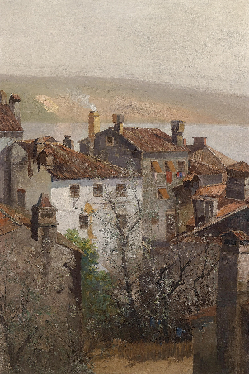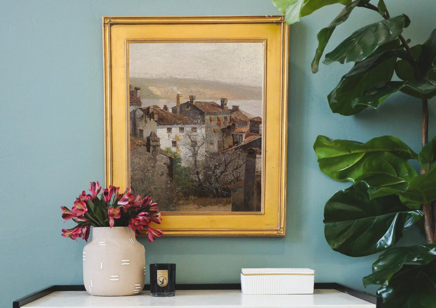 About The Print: A view of a quaint town, quiet and dimly illuminated by the soft light of the morning. Oil on canvas.