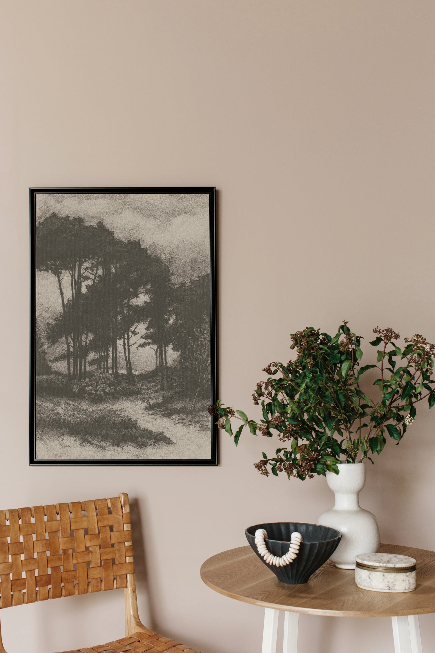 About The Print: Black and white lithograph of small path winding through tall trees. Lithograph print.